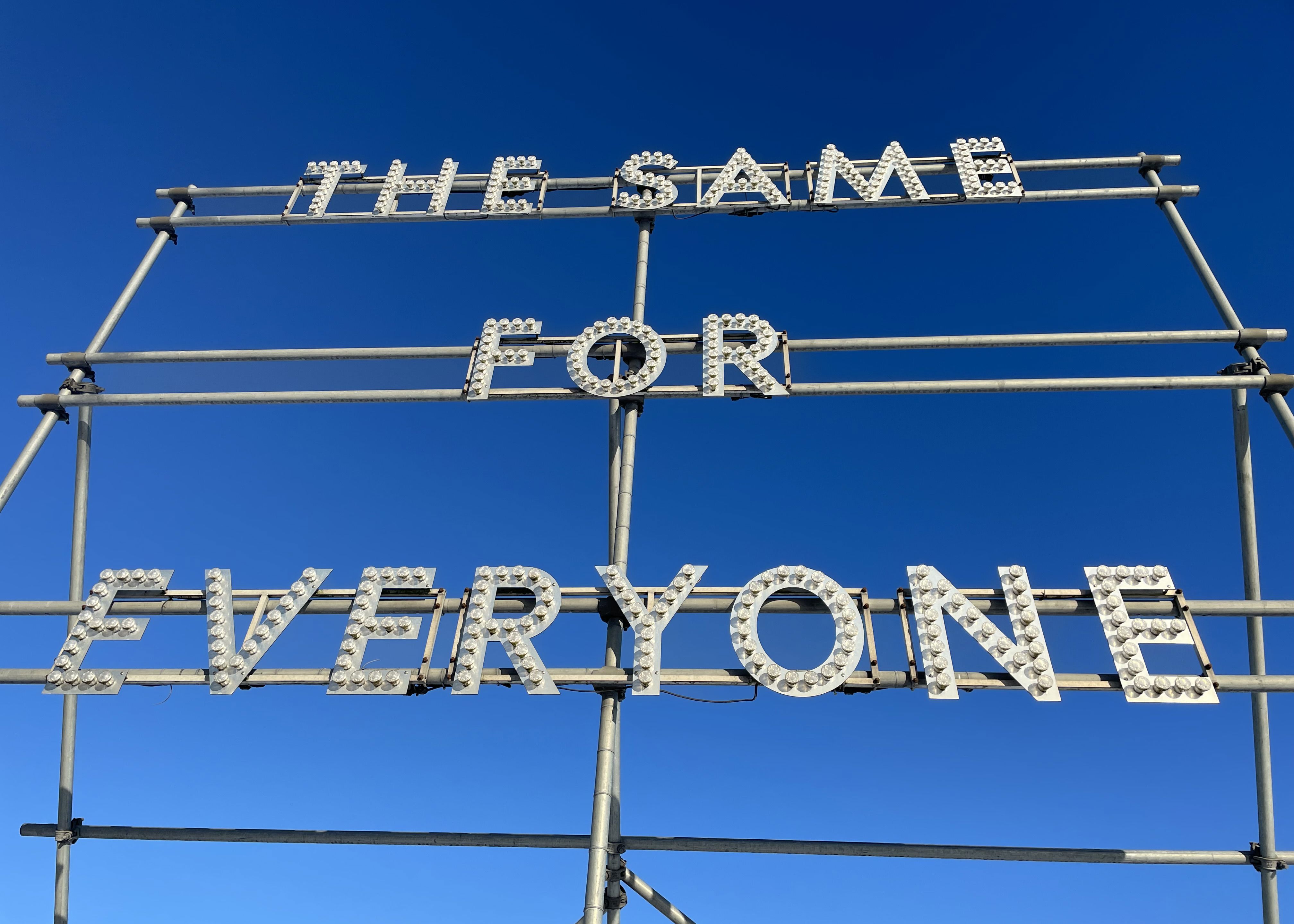The piece is one of ten identical light installations created by the recognized Scottish artist Nathan Coley for the European Capital of Culture in Aarhus 2017. Coley is known for his linguistic and poetic interventions in the public space. With the title The Same for Everyone he invites the spectator to reflect on a highly prioritized Danish value, ‘equality for all’.