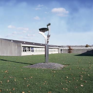 The stainless steel is characteristic of Børge Jørgensen. Oftentimes nature acts as inspiration for the abstract, yet organic shapes are reminiscent of sprouting growths. However, the sculpture also bears resemblance to an oversized tool. The upper part of the sculpture is able to twist around its own axis, symbolising the logo of AMU-Centeret, which stands for quality, flexibility, adaptability and development.